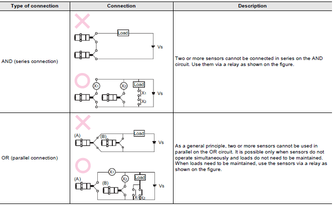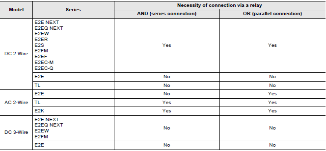 Both series and parallel connections are possible. However, some models require connection via a relay. Please refer to the table below. The number of units that can be connected, the connection method, and conditions vary depending on the sensor type (DC 2-wire, AC 2-wire, DC 3-wire) and series. For connection information, please refer to the "Connection Details".
