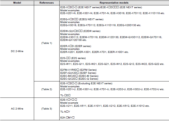 Table 2: DC 2-wire (Model example: E2E-X[]D[]-U)
