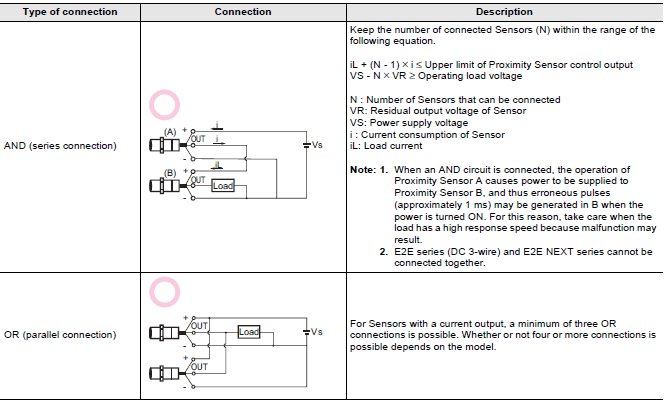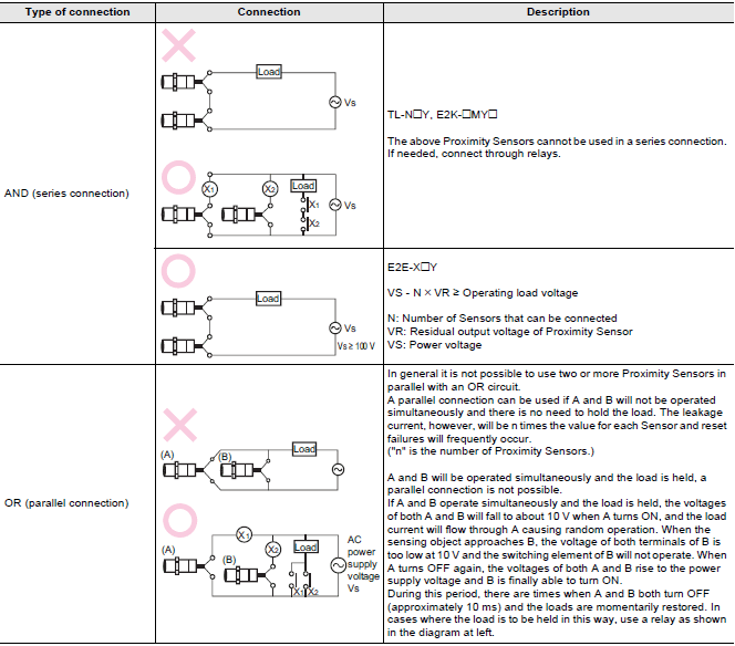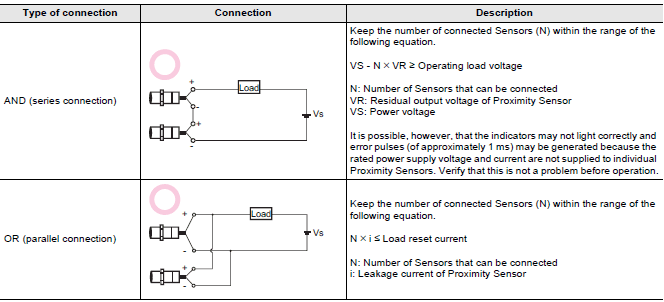 Note: When AND/OR connections are used with Proximity Sensors, the effects of erroneous pulses or leakage current may prevent use. Verify