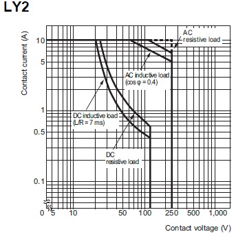 | Contact | Contact rated load | 10 A (Resistive load) 110 VAC 7.5 A (Inductive load (cosφ = 0.4)) 24 VDC 10 A (Resistive load) 24 VDC 5 A (Inductive load (L/R = 7 ms)) | Max. contact voltage | 250 VAC 125 VDC | Max. contact current | AC: 10 A DC: 10 A | Contact form | DPDT | Contact method | Single | Contact material | Ag alloy |