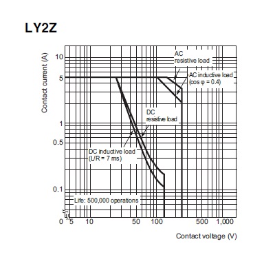 | Contact | Contact rated load | 110 VAC 5 A (Resistive load) 110 VAC 4 A (Inductive load (cosφ = 0.4)) 24 VDC 5 A (Resistive load) 24 VDC 4 A (Inductive load (L/R = 7 ms)) | Max. contact voltage | 250 VAC 125 VDC | Max. contact current | AC: 7 A DC: 7 A | Contact form | DPDT | Contact method | Bifurcated | Contact material | Ag |