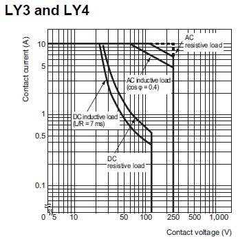 10 A (Resistive load) 110 VAC 7.5 A (Inductive load (cosφ = 0.4)) 24 VDC 10 A (Resistive load) 24 VDC 5 A (Inductive load (L/R = 7 ms)) |