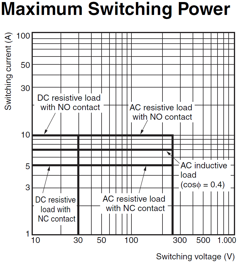 250 VAC 10 A (NO contact: Resistive load) 250 VAC 5 A (NC contact: Resistive load) 250 VAC 7 A (Inductive load (cosφ = 0.4)) 30 VDC 10 A (NO contact: Resistive load) 30 VDC 5 A (NC contact: Resistive load) |