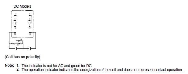 | Insulation resistance | Between coil and contacts: 100 MΩ min. (at 500 VDC) Between contacts of different polarity: 100 MΩ min. (at 500 VDC) Between contacts of same polarity: 100 MΩ min. (at 500 VDC) |
