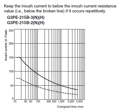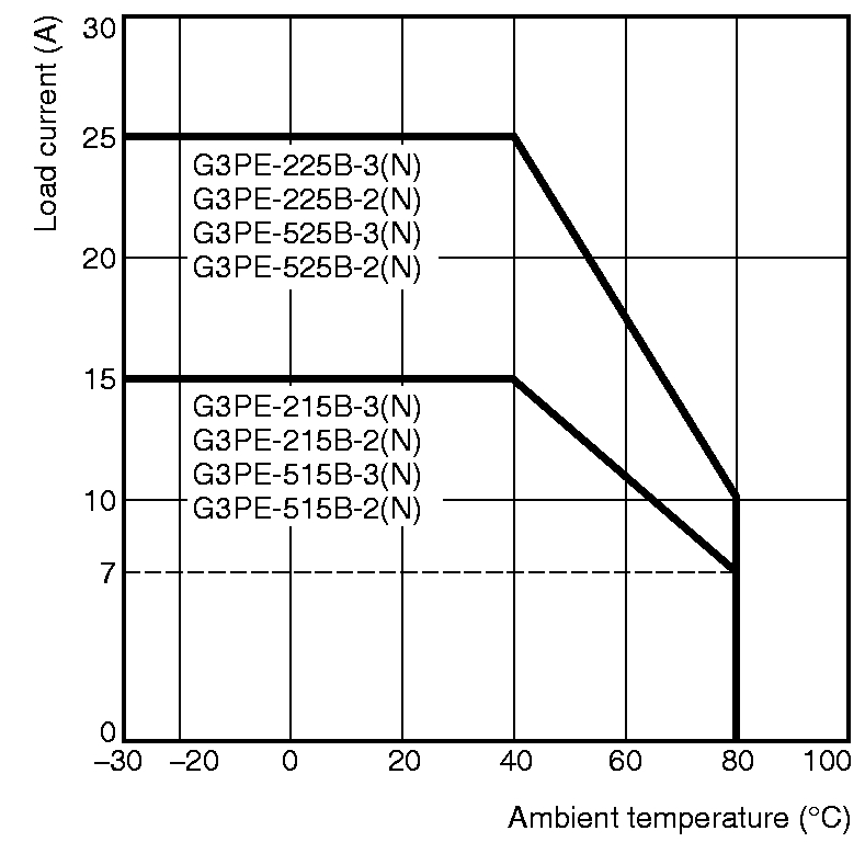 | Output | Rated load voltage | 100 to 240 VAC | Load voltage range | 75 to 264 VAC | Minimum load current | 0.2 A | Load current | 15 A (at 40 ℃) | Inrush current resistivity | 150 A (60 Hz 1 cycle) | Permissible I2**t | 121 A2s | Applicable load | Load carrying capacity | 5.1 kW (at 200 VAC) |